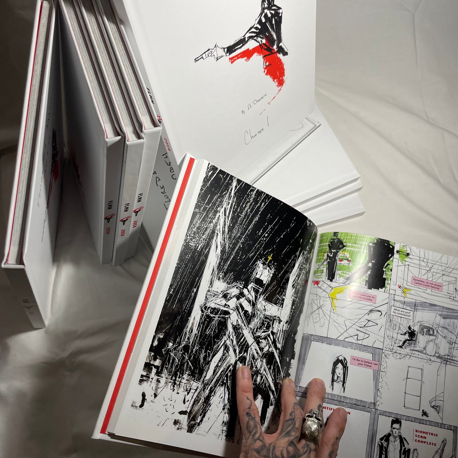 FLMN 2054 Chapter 1 book size is a 8.5x11 hardcover edition with over 100 pages of art. These 100 pages include just under 2000 shots/ panels of story and dozens of full splash page illustrations including maps to show where the story takes place.